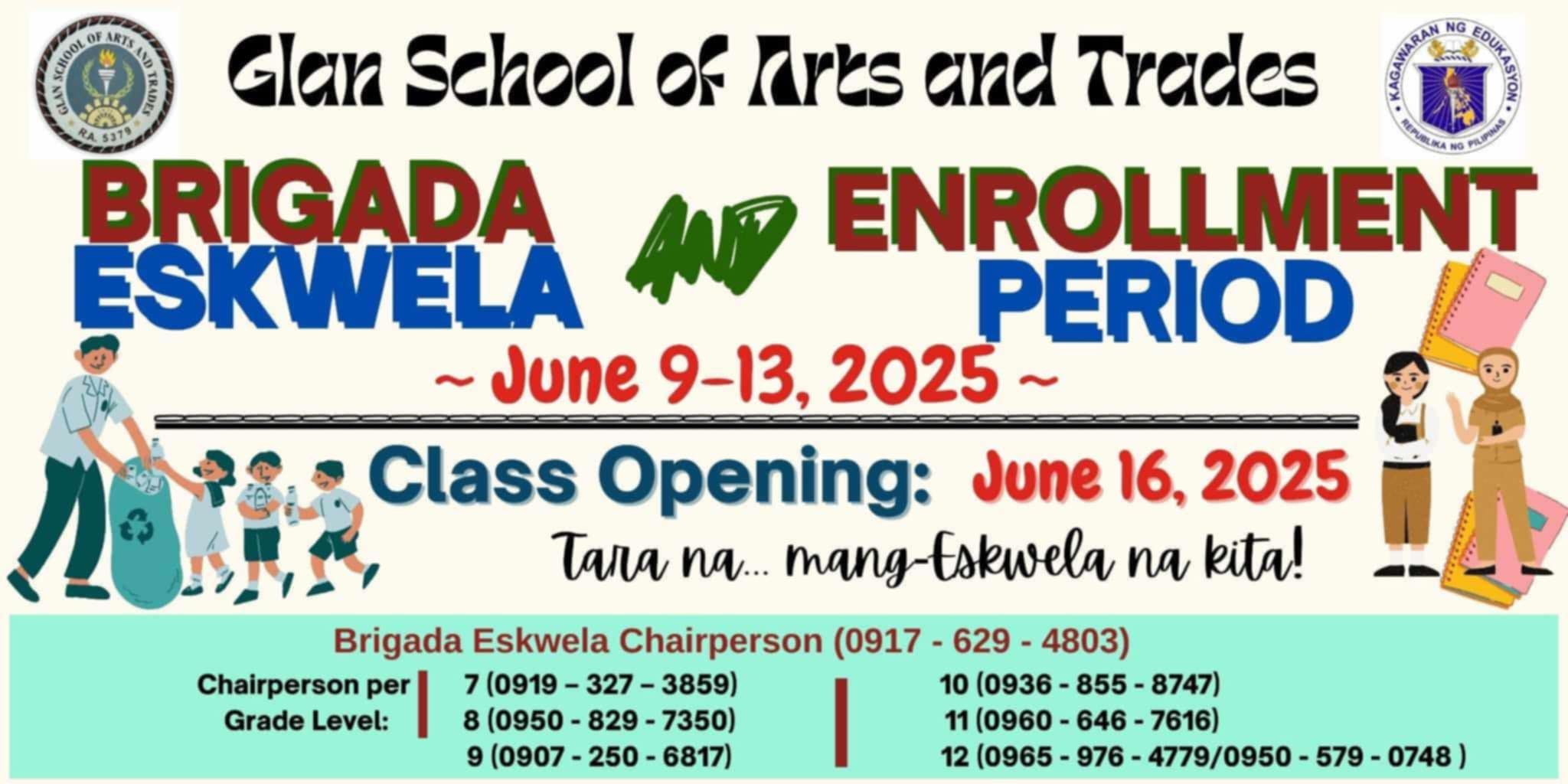 The GLAN SCHOOL OF ARTS AND TRADES is one of the operational educational institutions that aims to deliver quality education since 1971. It undergone series of challenges on its implementation just to capacitate and produce better education to serve in the community, in our country, and in the global world of challenge. It was considered one of the top performing schools in Sarangani Province. It also has its share in upholding the quality of education our country needs to better Filipino to produce productive and competitive innovations suited to public supply and demands.