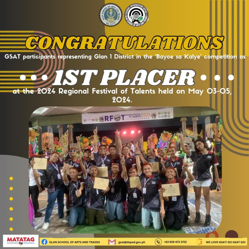 The GSAT Community headed by Dr. Josie Teofila N. Quijano, Vocational School Administrator II extends its immense gratitude and congratulations to all the learners and coaches who participated in the ‘Bayle sa Kalye’ competition for being the 1st Placer during the Regional Festival of Talents held on May 03-05, 2014 at Kidapawan City.